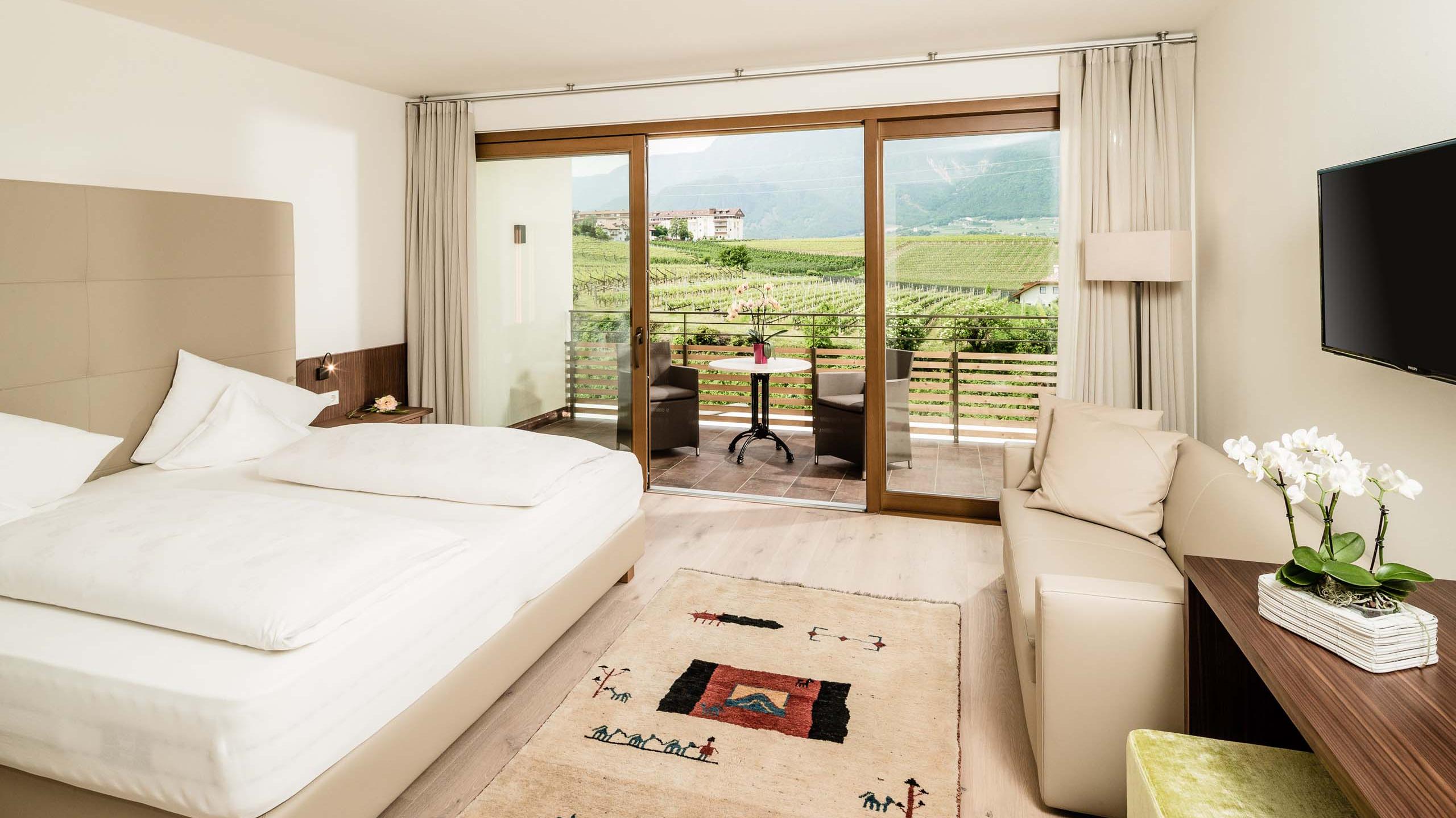 New furnished, sunny and quiet double-room with couch bed, with air condition and underfloor heating, balcony with panoramic view, oak floor, bathroom with shower bidet, free Wi-Fi, flat TV, safe and minibar