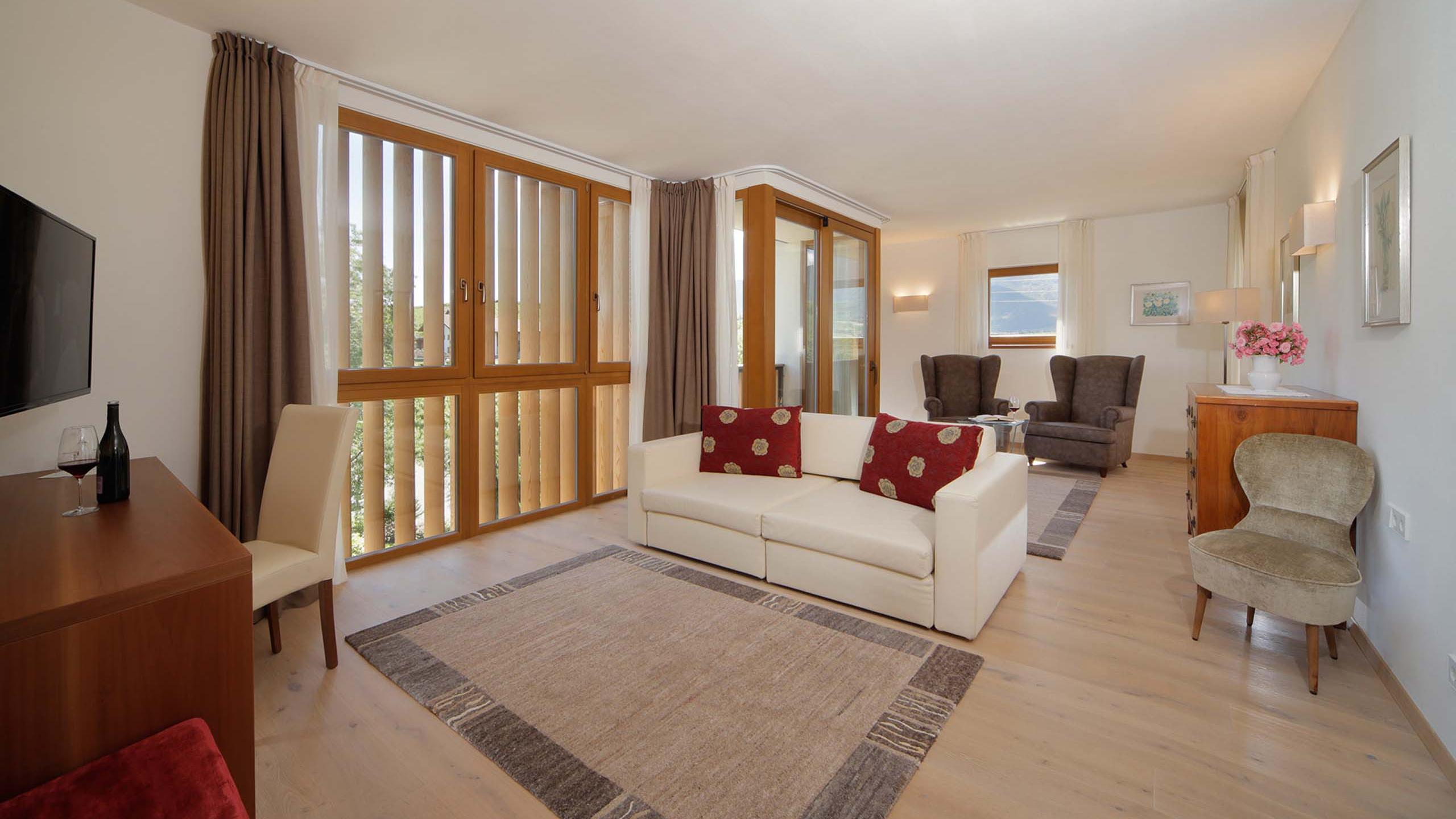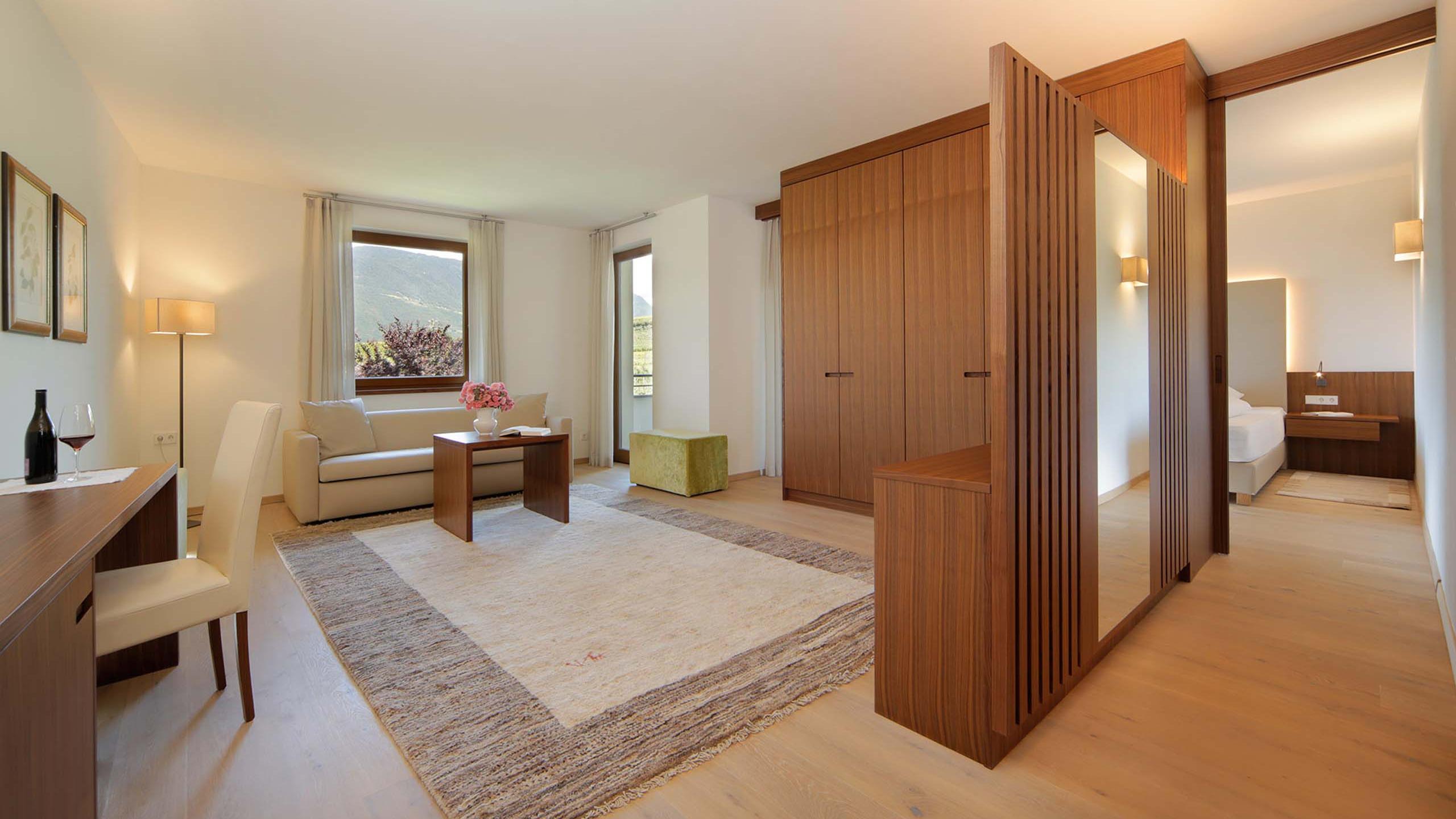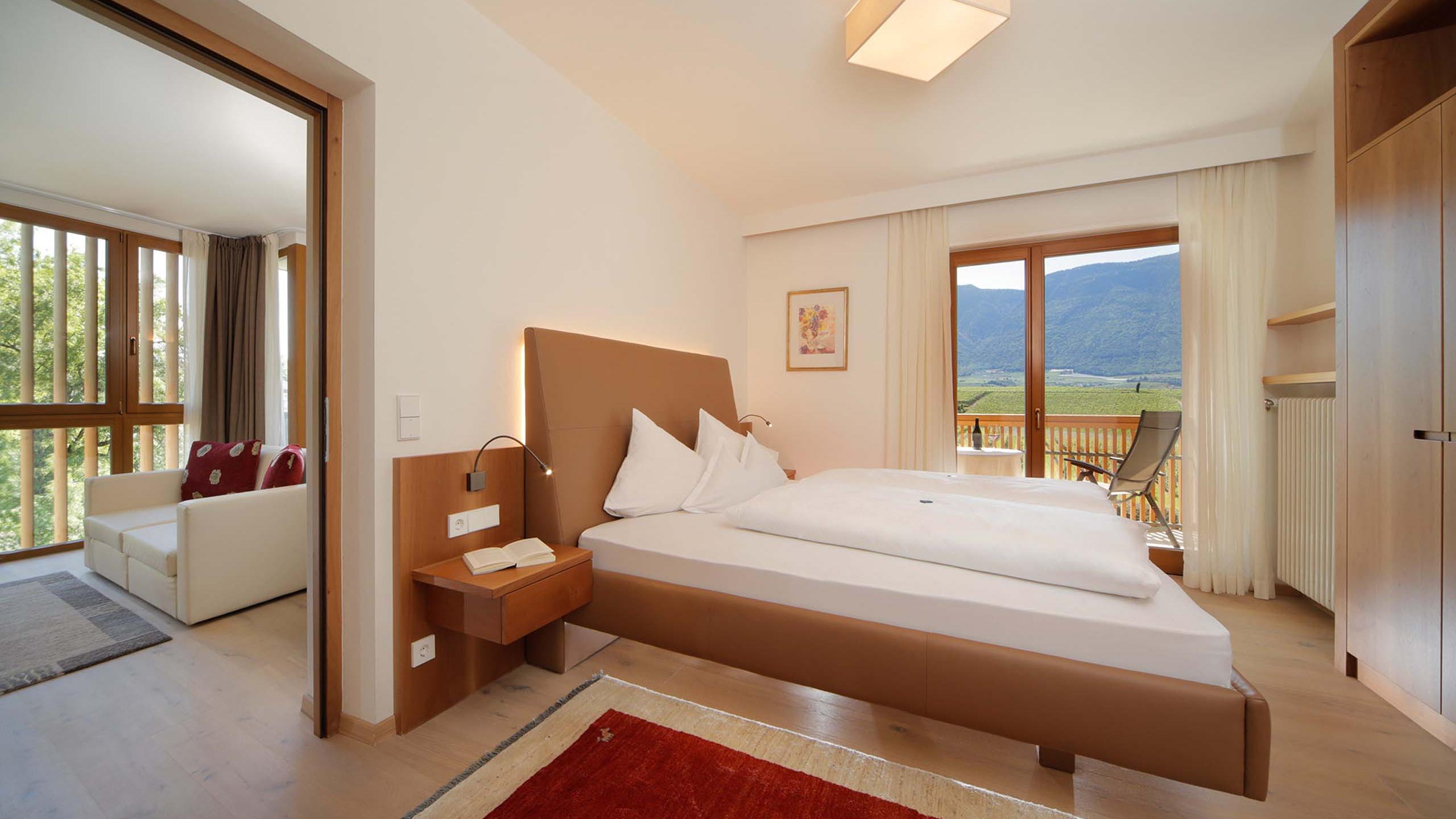 Helles ruhiges Familienzimmer mit Schlafzimmer und separatem Wohnraum, Balkon mit Panoramablick, Holzparkettboden, Klimaanlage, modern eingerichtet, Badezimmer mit Dusche, kostenloses W-LAN, Safe, Flat-TV, Minibar